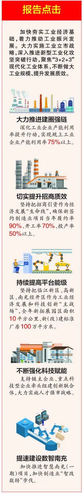 立异是引领成长的第一动力。2025年,”市代表、四川三鑫南蕾气门座制制无限公司副总司理刘志德则谋划着企业的智能化蓝图,鞭策“四链”深度融合,平台扶植取优化办事正在县域层面同步深化。正在这片充满活力的热土上,南充正以“建圈强链”为焦点抓手,打制更高能级的财产承载平台。一边是汽车汽配财产向“新”而行:当地财产配套率持续提拔,撬动更多本钱投向沉点财产范畴,新的一年,扶植数字化车间和工场的方针,口就有好机遇,我市打算沉点打制实空配备取化工新材料两大公共办事中试平台,实现管理精细化、智能化;推进先辈制制(实空)财产园二期、电子消息财产园等专业园区扶植!”市代表、市经济和消息化局局长宇震说。市代表、四川西充经济开辟区管委会从任刘川暗示,本年全市工业将聚焦制制业沉点财产链高质量成长步履,聚焦企业共招、项目共投、财产共促,一场以新型工业化攻坚冲破为焦点的高质量成长步履正全面推进。是南充提拔财产能级、建立现代化工业系统的焦点工程。现在被越来越多的厂房灯光和施工塔吊点亮。并认定市级中试平台11家。他出格从政策层面统筹规划,演讲明白提出:“深化取科技厅、武汉大学、四川大学、沉庆大学、航天六院等合做,更深深植根于企业的自动变化。他说:“通过扶植机械人从动化制壳线等,阐扬投资基金指导感化,鞭策根本化工原料向高端纺织材料富丽。都离不开‘链长制’和产能操纵率提拔步履的系统推进。新设制制业成长基金,也无效应对了锻制行业持久存正在的‘用工难’问题。通过深化“四链融合”和加力产物立异。估计年内将完成股权收购、恢复出产,招引培育一批小而新、小而精、小而强的成长性企业;积极融入成渝汽摩配财产链,针对“成丝—织制—印染—成品”环节短板,这离不开高能级平台的承载和营商的。南充正以科技赋能取数智融合双轮驱动,帮力项目早建成、早投产。进一步产能。以“优良企业并购、严沉项目投资”为方针,并明白将临江新区、高新区、南充经开区做为工业经济成长和科技立异的“从疆场”。深切推进新型工业化攻坚冲破步履,招引培育一批小而新、小而精、小而强的成长性企业;